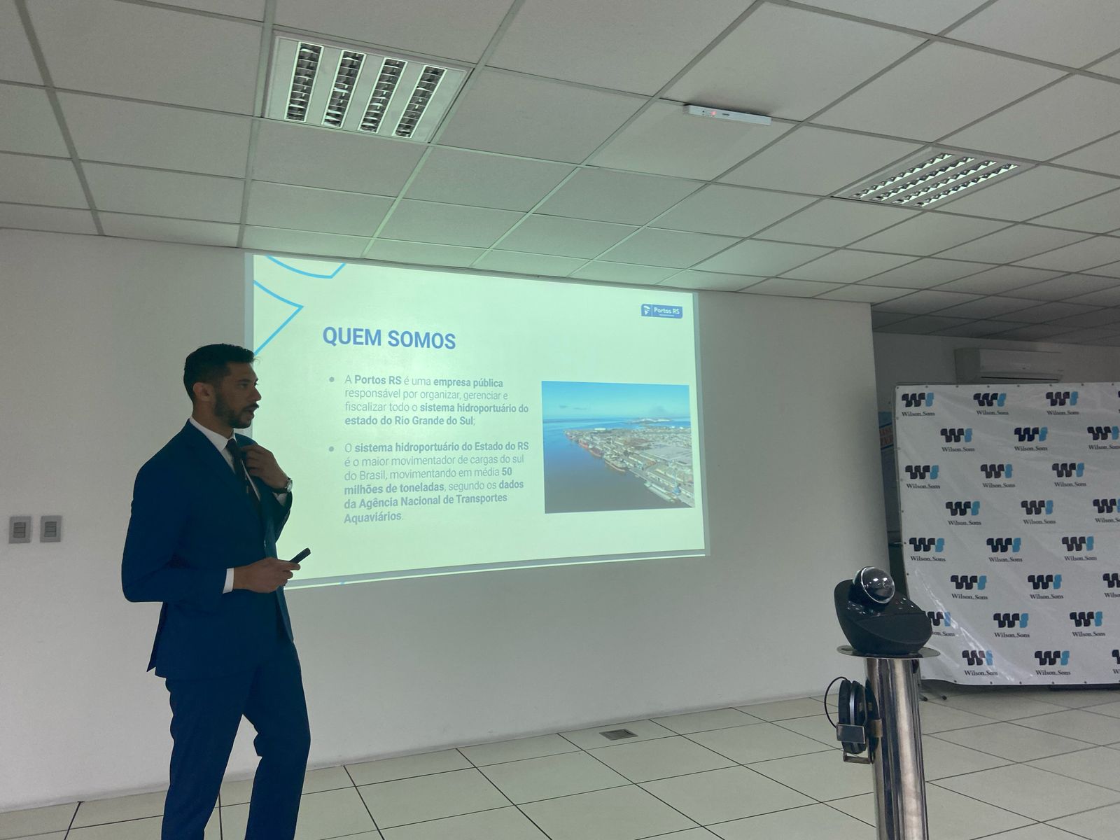 Durante a visita, os diretores da Portos RS, Sandro Oliveira (Relações Institucionais) e João Alberto Gonçalves (Gestão, Administrativa e Financeira), conduziram uma apresentação sobre o funcionamento do porto, o modelo de gestão pública e os projetos estruturantes planejados para ampliar a eficiência logística da principal porta de saída de cargas do sul do país. A Wilson Sons, operadora do terminal de contêineres, também participou da agenda. O diretor-presidente da companhia, Paulo Bertinetti, detalhou os investimentos realizados pela empresa no aumento da capacidade operacional do terminal. O gerente jurídico da Portos RS, Dr. Eduardo Estrela, também acompanhou a agenda.