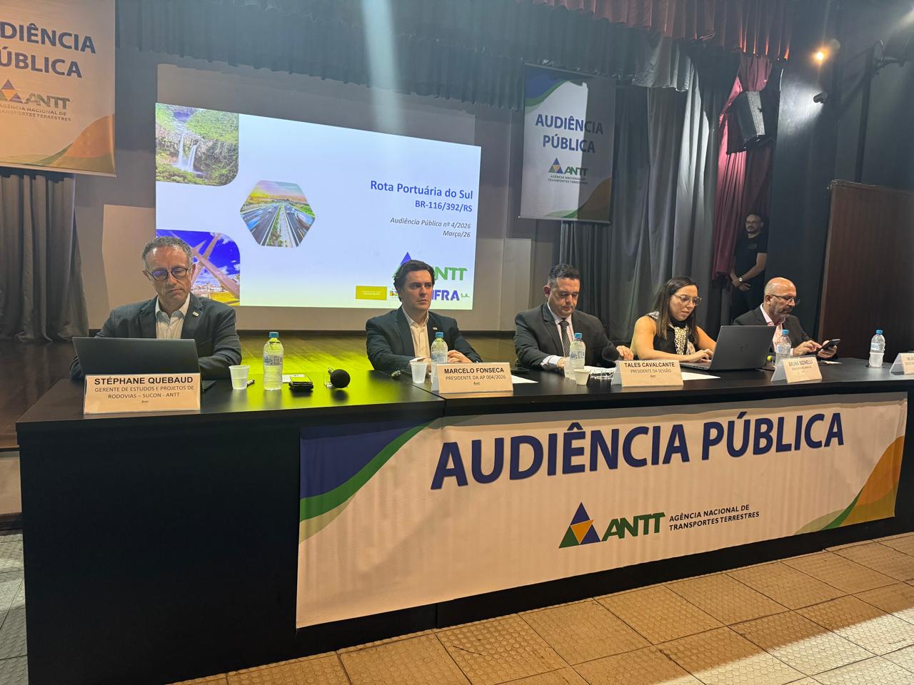 No período da tarde, as propostas foram levadas à audiência pública realizada em Pelotas, intitulada 3ª Audiência Pública para Debater a Nova Concessão dos Pedágios da Zona Sul, integrando o processo de participação social e institucional conduzido pela ANTT. A sessão foi conduzida pelo superintendente de Concessão da Infraestrutura da ANTT, Marcelo Fonseca, que presidiu a mesa, e contou com a presença do ouvidor da ANTT, Tales Cavalcante, do gerente de Estudos e Projetos de Rodovias da Agência, Stéphane Quebaud, do coordenador de Estudos e Projetos de Rodovias, Nilson Correa Gonze, e da representante da Infra S.A., Bruna Bizinelli.