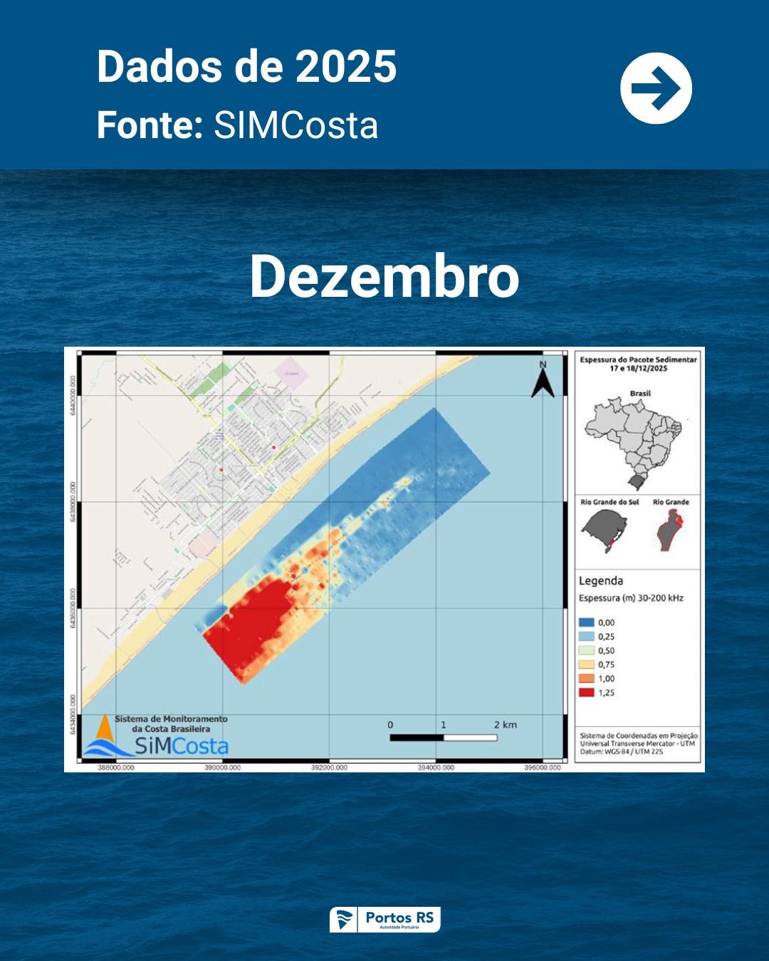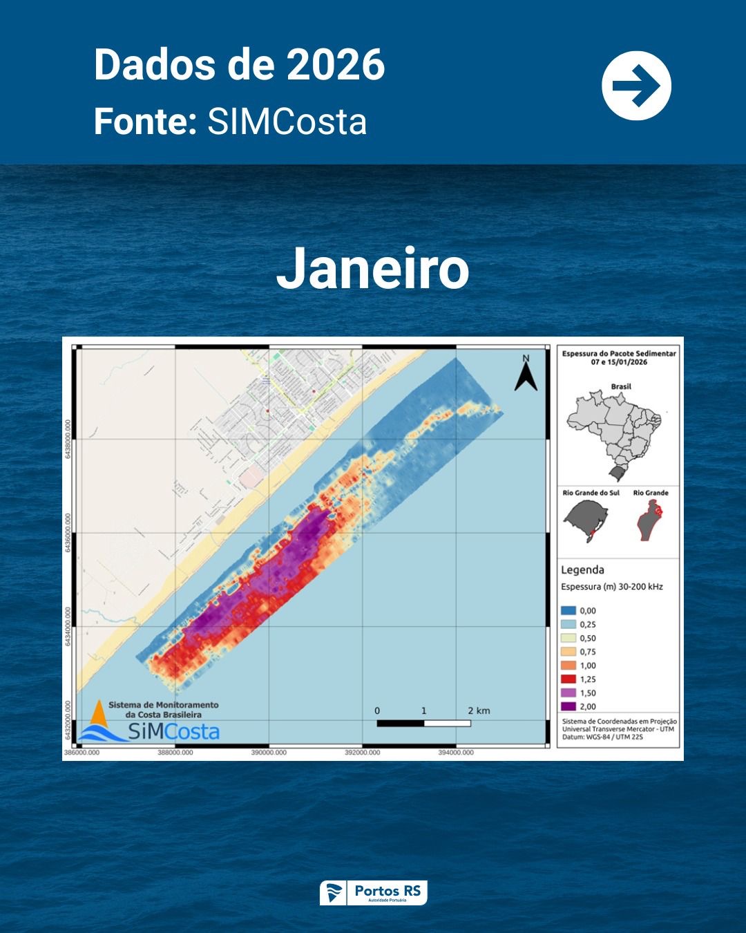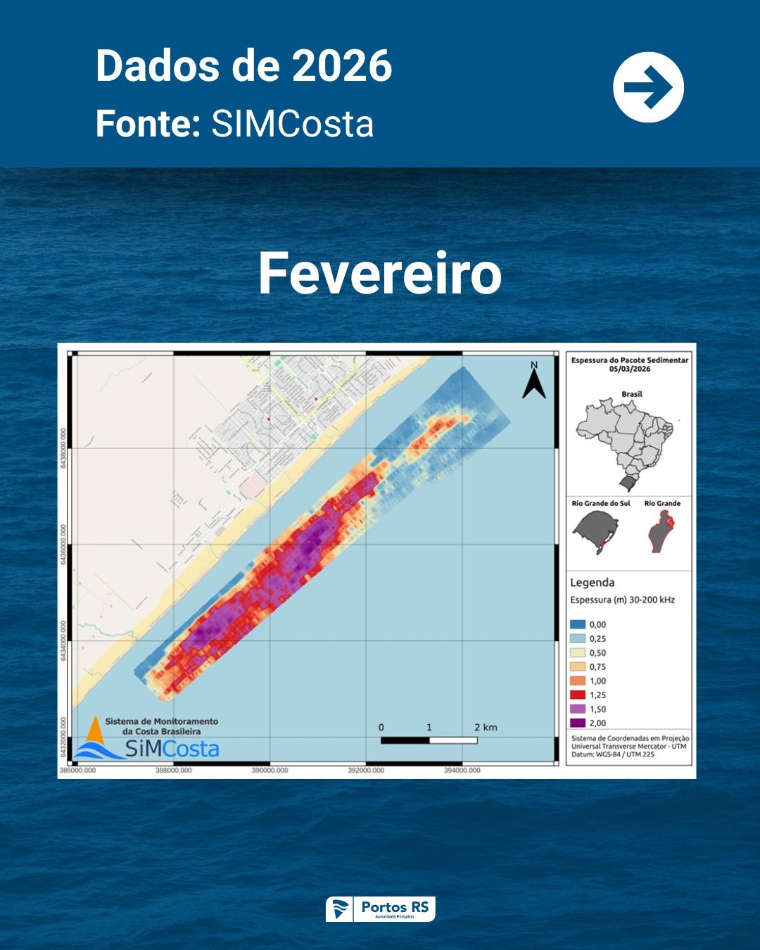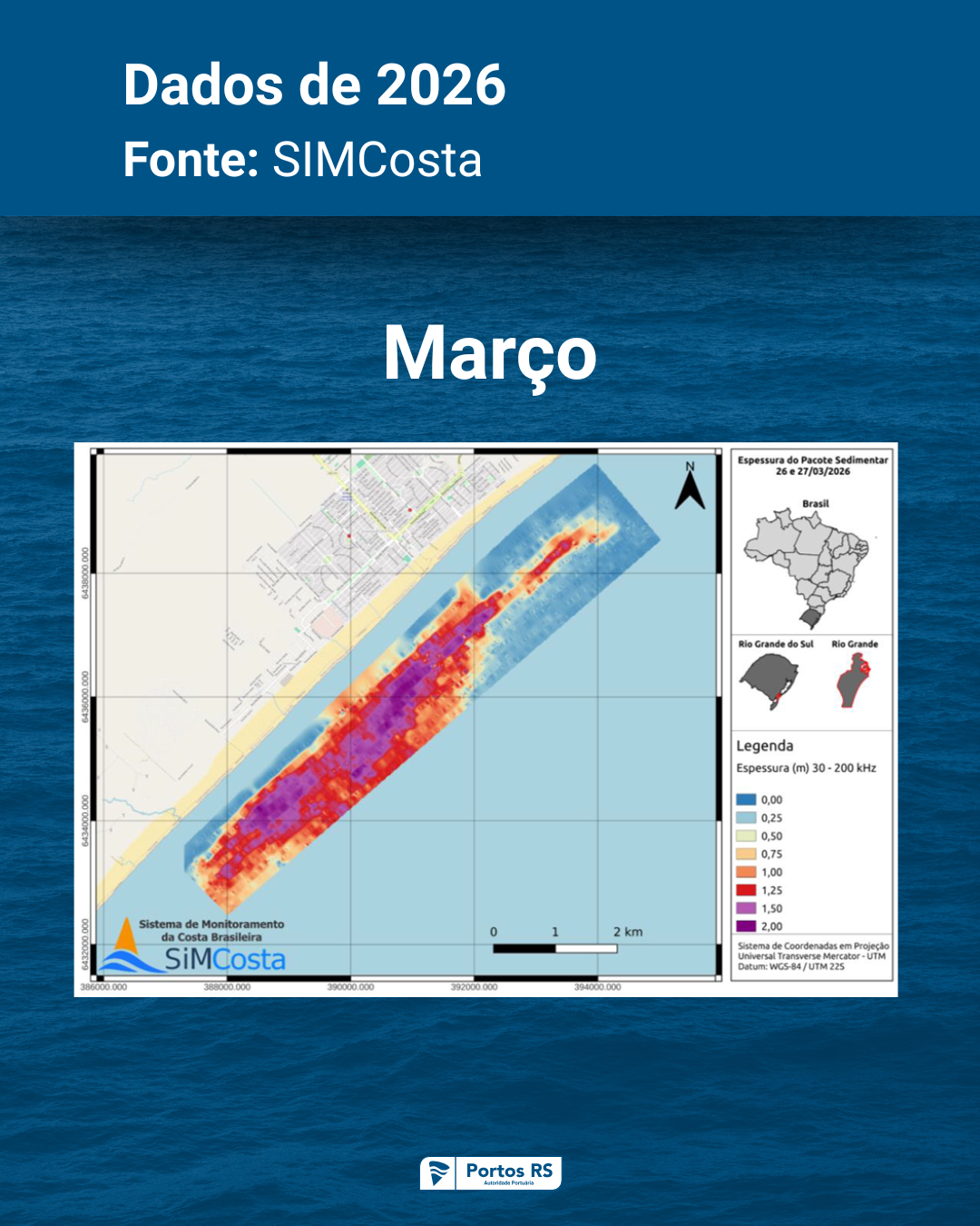 O monitoramento do bolsão de lama segue cronograma mensal de amostragem e evidencia elevada variabilidade natural, com períodos de acúmulo, transporte e dispersão dos sedimentos. O trabalho é realizado em parceria com a Universidade Federal do Rio Grande (FURG), no âmbito do Sistema de Monitoramento da Costa Brasileira (SiMCosta), por meio do Contrato de Prestação de Serviço nº 1194/2022.
